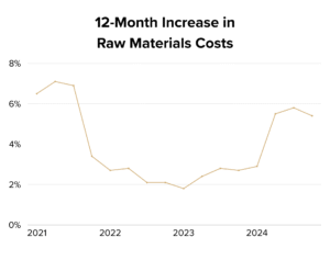 While a reduction in the expected raw materials costs is a welcomed change (5.8% increase in Q2 2025 to 5.4% increase in Q3 2025), manufacturers are still anticipating higher-than-normal cost increases over the next 12 months at a level nearly matching that of 2021. Keep in mind, those increased costs of raw materials in 2021 contributed to inflation being over 9% in the summer of 2022.